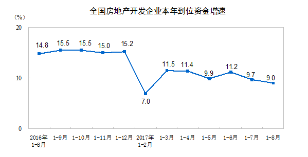 人民網(wǎng)北京9月14日電 國(guó)家統(tǒng)計(jì)局今日公布了2017年1-8月份全國(guó)房地產(chǎn)開發(fā)投資和銷售情況。數(shù)據(jù)顯示,全國(guó)房地產(chǎn)開發(fā)投資增速在連續(xù)3個(gè)月回落之后,前8月增速與前7個(gè)月持平。商品房銷售面積與銷售額增速回落,房地產(chǎn)開發(fā)企業(yè)到位資金增幅開始收窄。