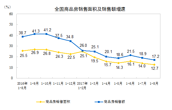 前8月商品房銷售額78096億元,增長(zhǎng)17.2%,增速回落1.7個(gè)百分點(diǎn)。其中,住宅銷售額增長(zhǎng)14.2%,辦公樓銷售額增長(zhǎng)26.6%,商業(yè)營(yíng)業(yè)用房銷售額增長(zhǎng)35.4%。