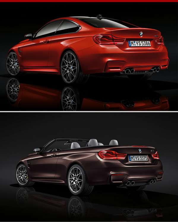 新款M4雙門轎跑車和M4敞篷轎跑車的車頭雙腎型進氣格柵、鰓部元件、尾標以及黑色鍍鉻排氣管,均采用黑色高光設計。新車標配自適應全LED大燈,六邊形線條勾勒出BMW經典雙圓大燈。配備20英寸輕質星式輪輻鋁合金輪圈,全新LED尾燈。新車添加2款專屬車漆顏色,托帕石棕和丹泉石藍色,更加突顯M的運動時尚特征。