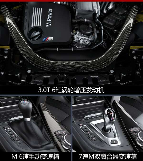 動力方面,M4雙門轎跑車和M4敞篷轎跑車均搭載了采用M TwinPower Turbo渦輪增壓技術的3.0升6缸發動機。得益于M雙渦輪增壓技術,發動機最大功率可達317千瓦,峰值扭矩為550牛米。可搭配M 6速手動變速箱或帶有Drivelogic換擋邏輯的7速M雙離合變速箱,M4雙門轎跑車百公里加速只需4.1秒,M4敞篷轎跑車為4.4秒。M4雙門轎跑車和敞篷轎跑車的綜合耗油分別為每百公里8.3升和8.7升。