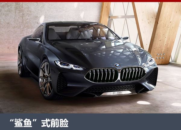 全新8系采用“鯊魚”式前臉造型,進氣格柵由曾經的分體式變成為整體式設計,同時“雙腎”尺寸有所增大。由上自下匯合成“y”字形的格柵豎條幅,激光雙大燈和“六邊形”雙LED日間行車燈組成的頭燈,以及格柵兩側大尺寸的導流孔,共同組成兇狠的前臉造型。