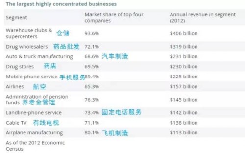 上圖顯示了美國集中度最高的幾大行業,排名前四的龍頭企業獲得了整個行業幾乎70%的利潤。
