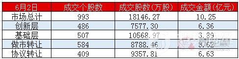 截止6月2日收盤,新三板市場成交量為1.81億股,出現成交的有993只股票,成交總額10.25億元。目前為止,新三板總掛牌11256家,創新層1393家,基礎層9863家; 做市轉讓1564家,協議轉讓企業9692家。