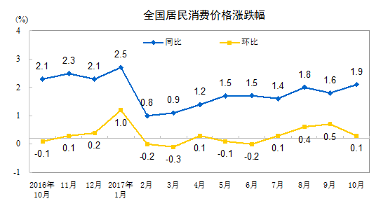 2017年10月份,全國居民消費價格同比上漲1.9%。其中,城市上漲1.9%,農村上漲1.7%;食品價格下降0.4%,非食品價格上漲2.4%;消費品價格上漲1.1%,服務價格上漲3.2%。1-10月平均,全國居民消費價格總水平比去年同期上漲1.5%。