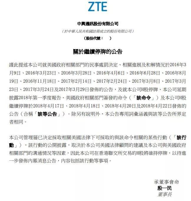 ▲中興通訊公司網站上關于股票繼續停牌的公告
