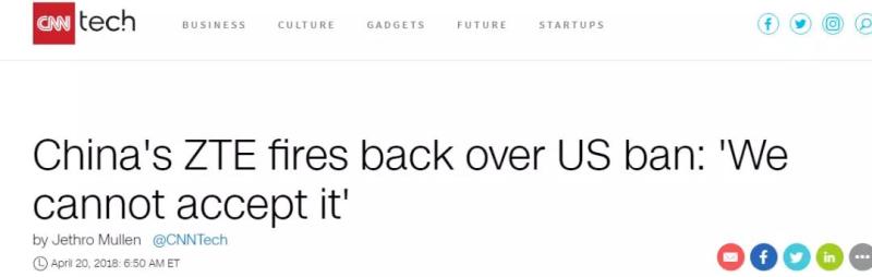 ▲4月20日,CNN網站刊登題為《中興回應美國政府禁令:“我們不能接受”》的報道。