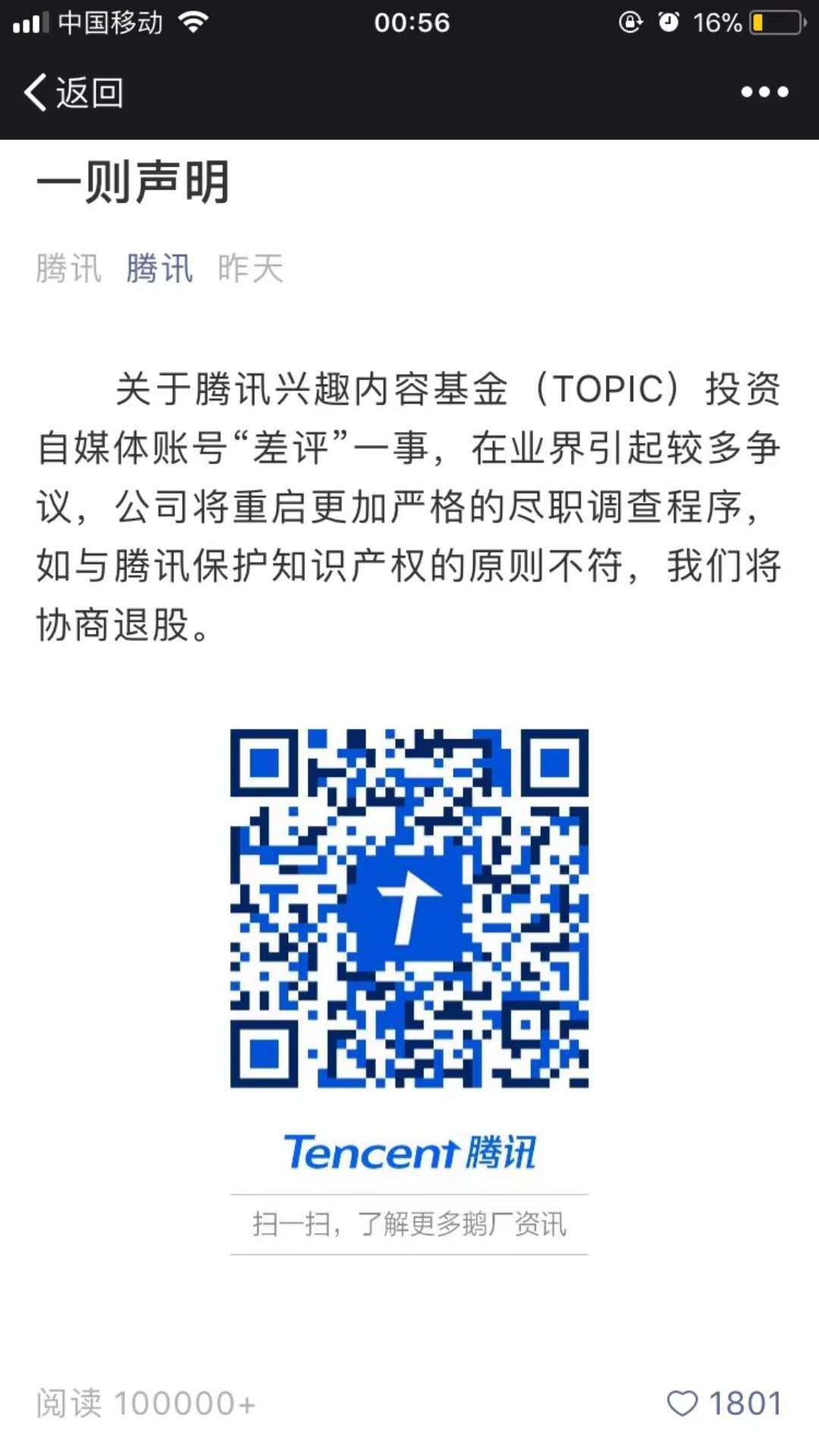 5月24日晚間,騰訊官方發布聲明稱,關于騰訊興趣內容基金(TOPIC)投資自媒體賬號“差評”一事,引起業界較多爭議。
