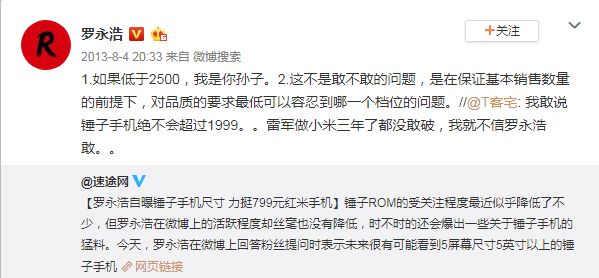 時間回到2013年8月,彼時錘子手機尚未發布,有網友斷言,錘子手機絕不會超過1999元,羅永浩則回應:“如果低于2500,我是你孫子”。2014年10月,錘子手機宣布降價至1980元起,遠遠低于2500元,不少網友去羅老師微博下面留言圍觀,想占羅老師便宜。后來羅永浩解釋稱:5個月前手機發布時是3000元,并表示作為企業負責人,被圍觀群眾有理或無理地“打臉”,是份內工作。
