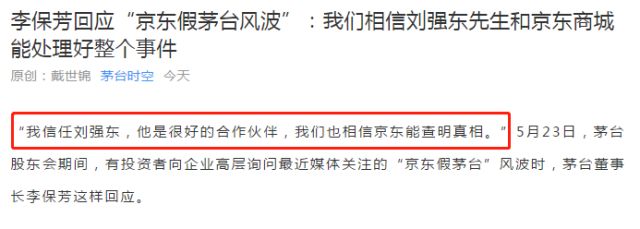 針對此事,茅臺董事長李保芳回應“相信京東能查明真相”,目前,茅臺已暫停對京東自營供貨。