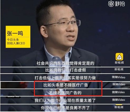 2016年11月27日,今日頭條創始人兼CEO張一鳴曾做客央視《對話》。在節目中,他表示,頭條不接醫療廣告,“我們認為整個行業現在質量太差了...我們就整個醫療廣告都不讓接入系統。”