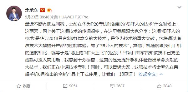 上面幾位大佬都有實錘,下面將出場的這位比較特殊,他的錘還在路上。5月23日,華為高級副總裁余承東在微博發布消息,表示華為將有“很嚇人的技術”亮相,有了這項技術后,其他手機速度和華為手機速度相比,就等于是“地上跑”和“天上飛”的區別,產品的性能體驗將大幅提升。