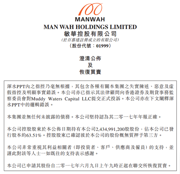 公司已向香港證券及期貨事務(wù)監(jiān)察委員會(huì)提交正式投訴。本集團(tuán)并無(wú)任何未披露的債務(wù),本公司堅(jiān)持認(rèn)為2017年年報(bào)正確。