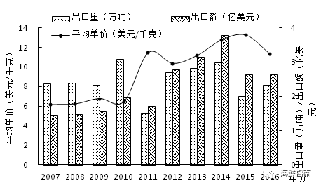 我國小龍蝦出口市場主要集中在美國和歐洲,占出口市場比重的80%以上。受國內消費刺激及技術性貿易壁壘影響,2015年后小龍蝦出口量總體呈下降趨勢。2016年小龍蝦出口量較2014年降低0.64萬噸,下降21.48%。從出口價格情況看,2007年以來小龍蝦出口單價呈總體上升趨勢,但2016年受國際蝦價下跌影響,出口單價出現下滑。近年來由于國內市場價格迅速上漲,很多出口企業紛紛轉向拓展國內市場。