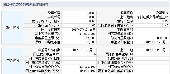 根據(jù)交易所公告,無錫隆盛科技股份有限公司于2017年7月25日起在深圳證券交易所創(chuàng)業(yè)板上市交易。
