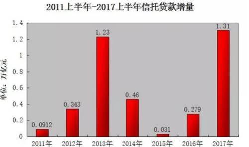 據央行統計數據顯示,今年上半年信托貸款規模增量為1.31萬億元,而在2011年至2016年同期,信托貸款增量分別是913億元、3432億元、1.23萬億元、4601億元、309億元、2792億元。也就是說,今年上半年信托貸款規模增量創近7年之最。這一比例已接近2013年同期數字,眾所周知在2013年前后,信托非標融資正值鼎盛。因為狂飆突進的規模,引得大家對TA十分好奇。