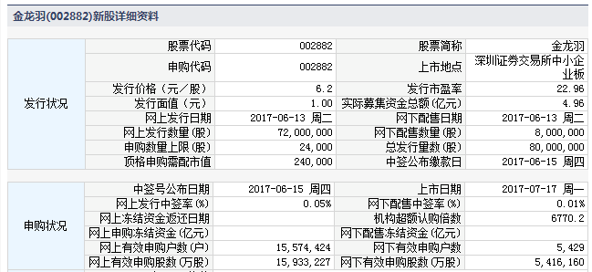 根據交易所公告,金龍羽集團股份有限公司于2017年7月17日起在深圳證券交易所中小企業板上市交易。