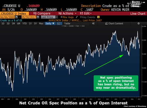 當我們將原油期貨市場的大規模凈頭寸轉化為公開利率的百分比時,最近的價格上漲似乎并不可怕。