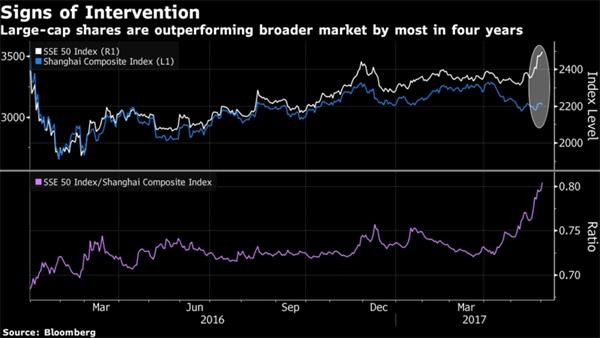 彭博報道稱,上證50指數(shù)能跑贏大盤得益于政府的政策:去杠桿化的監(jiān)管行動正在推升小型私營企業(yè)的融資成本,同時也促使大批散戶離開股市。聯(lián)昌國際證券的報告顯示,為了避免市場出現(xiàn)更深層次的拋售,國有基金(俗稱“國家隊”)通過購買大盤股來支撐市場。上周穆迪下調(diào)中國評級更是增加了這種動力。