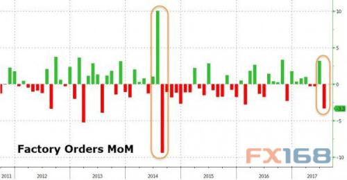 (美國工廠訂單月率走勢圖,來源:Zerohedge、FX168財(cái)經(jīng)網(wǎng))