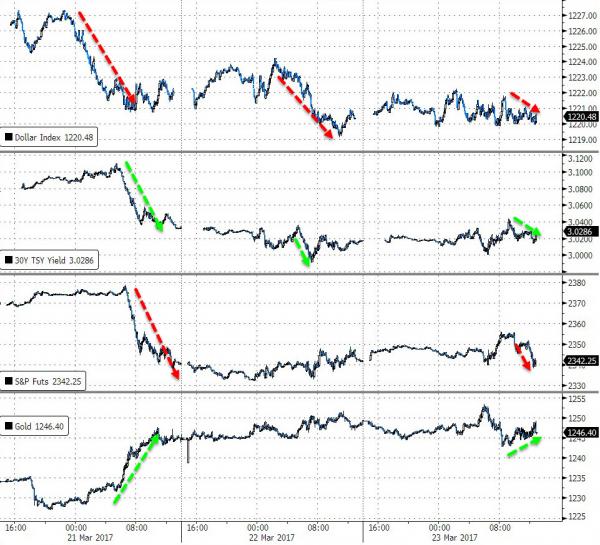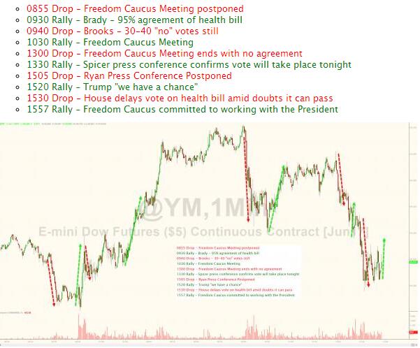 事實上,如果你關注了隔夜的金融市場,便不難發現,在美聯儲主席耶倫未能在周四的講話中涉及更多貨幣政策指引后,全球金融市場便始終圍繞著醫保案的進程而動。如下圖所示,道瓊斯指數期貨合約的任何風吹草動,幾乎都能從此次醫保案的爭論中找出相匹配的時間點。