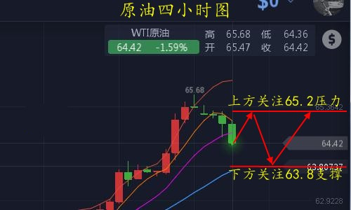 原油操作策略:反彈65.0-65.2附近空,止損65.5,目標64.0-63.8;回調63.8附近多,止損63.3,目標65.2-65.5;