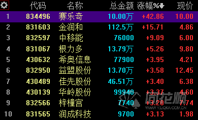 漲跌幅方面,賽樂奇上漲42.86%,領漲創(chuàng)新層個股,2只創(chuàng)新層個股漲幅超10%,漲幅榜前十如下圖: