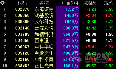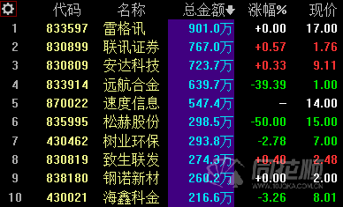 成交額方面,雷格訊成交901.00萬元,領先創(chuàng)新層企業(yè),共1只創(chuàng)新層個股成交破千萬,成交額前十如下圖: