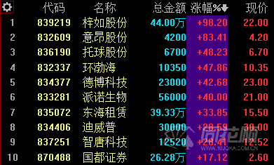 漲跌幅方面,梓如股份暴漲98.20%,領漲基礎層個股,共16只基礎層個股漲幅超10%,基礎層漲幅榜前十名如下圖: